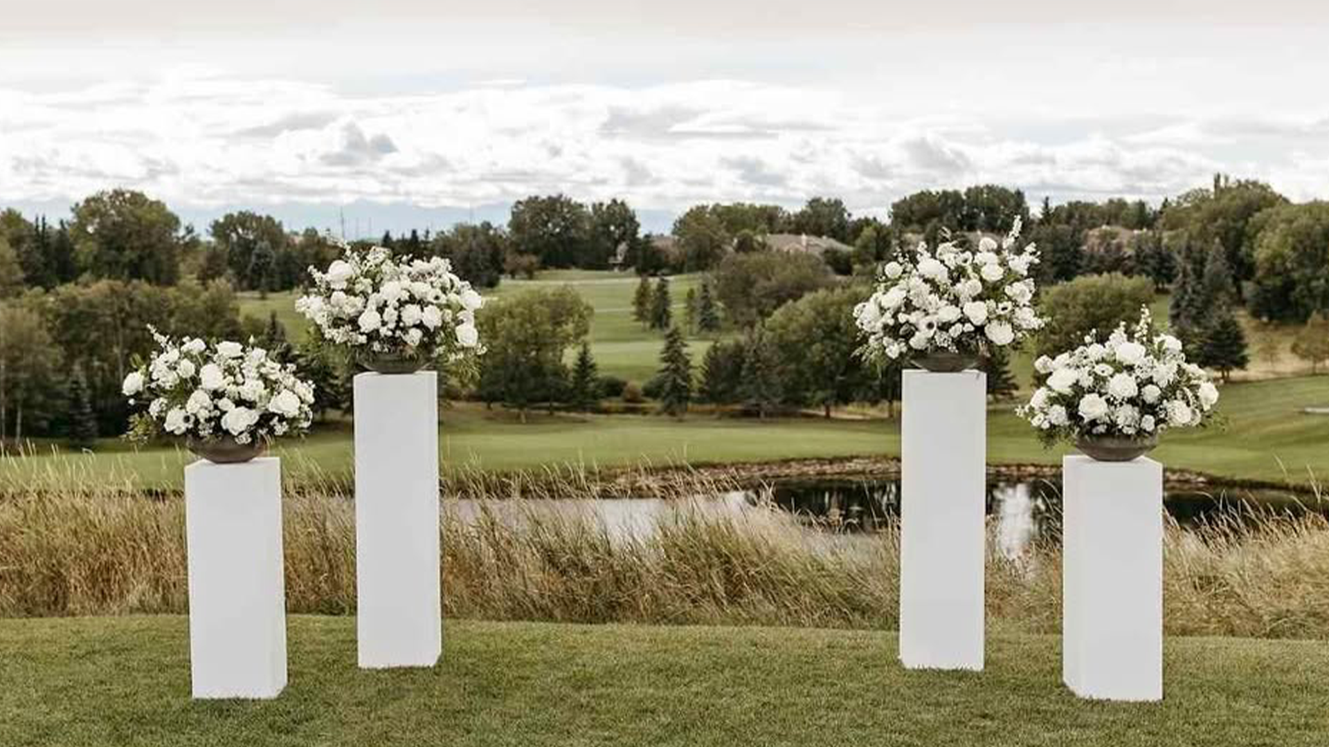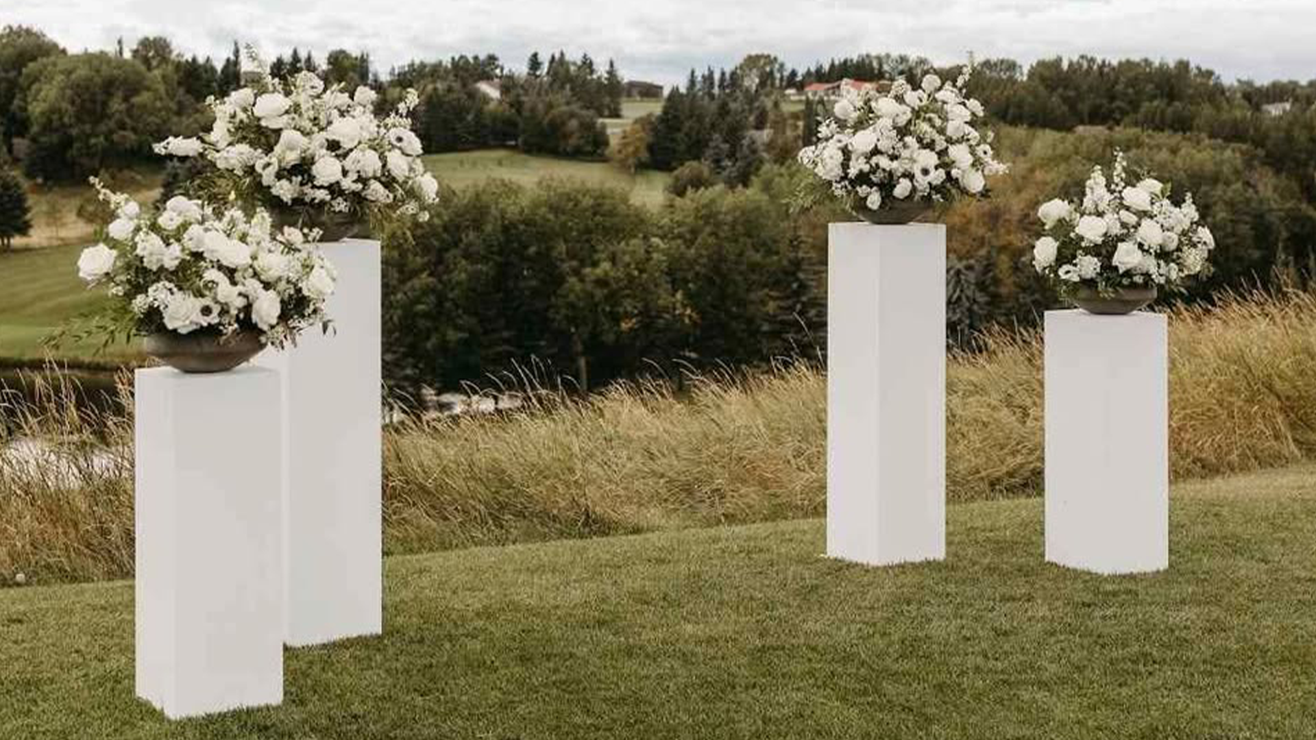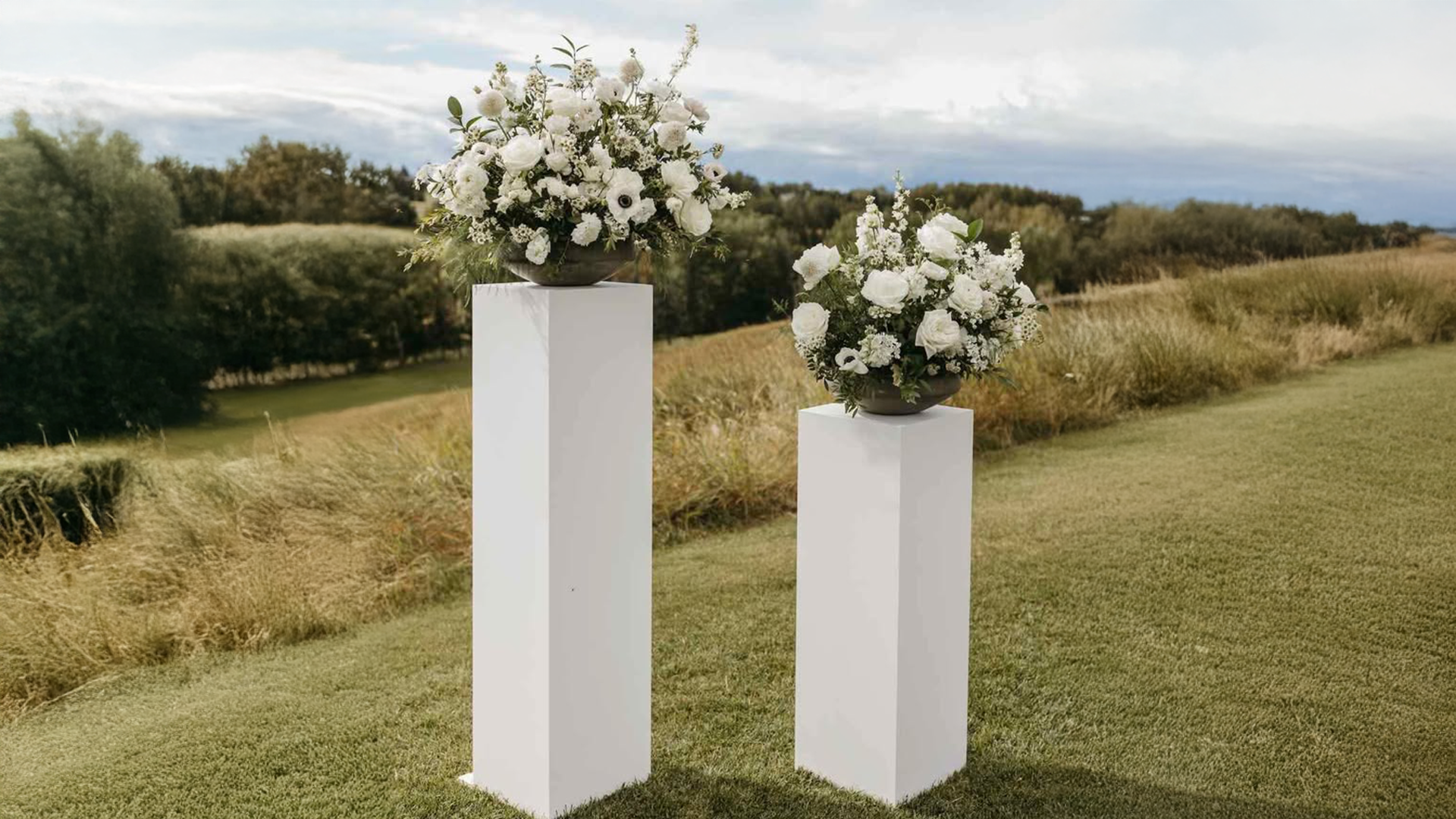 Four white square pillars. Large pillars 4 feet tall, small pillars 3 feet tall. They have adjustable feet that can be used to level pillars on uneven ground.
